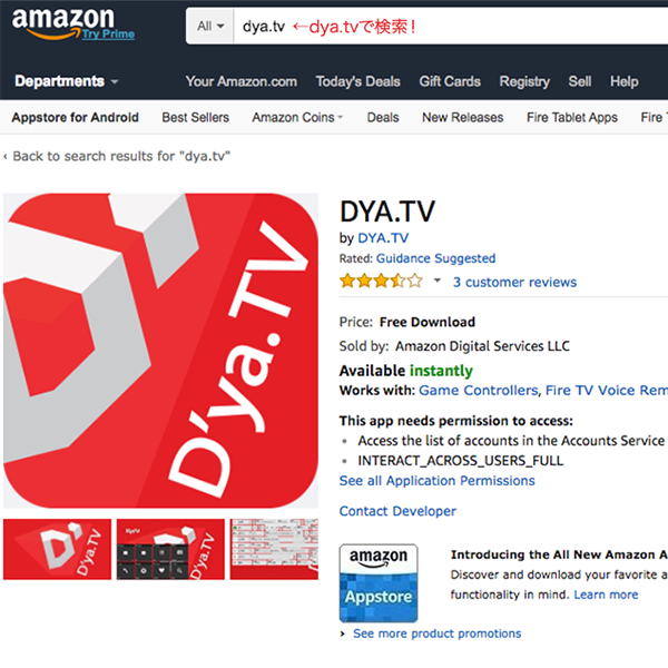 www.amazon.comのアマゾンアカウントへログインした後、検索バーからDYA.TVアプリを検索。表示のDYA.TVアプリをダウンロードした後、どの機器へインストールするかを決定する。