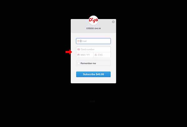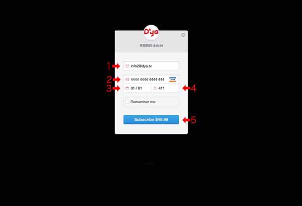 クレジットカード情報1-弊社登録Eメール,2-カード番号,3-有効期限,4-CVC番号を入力し5-Subscribeボタンをクリックする。